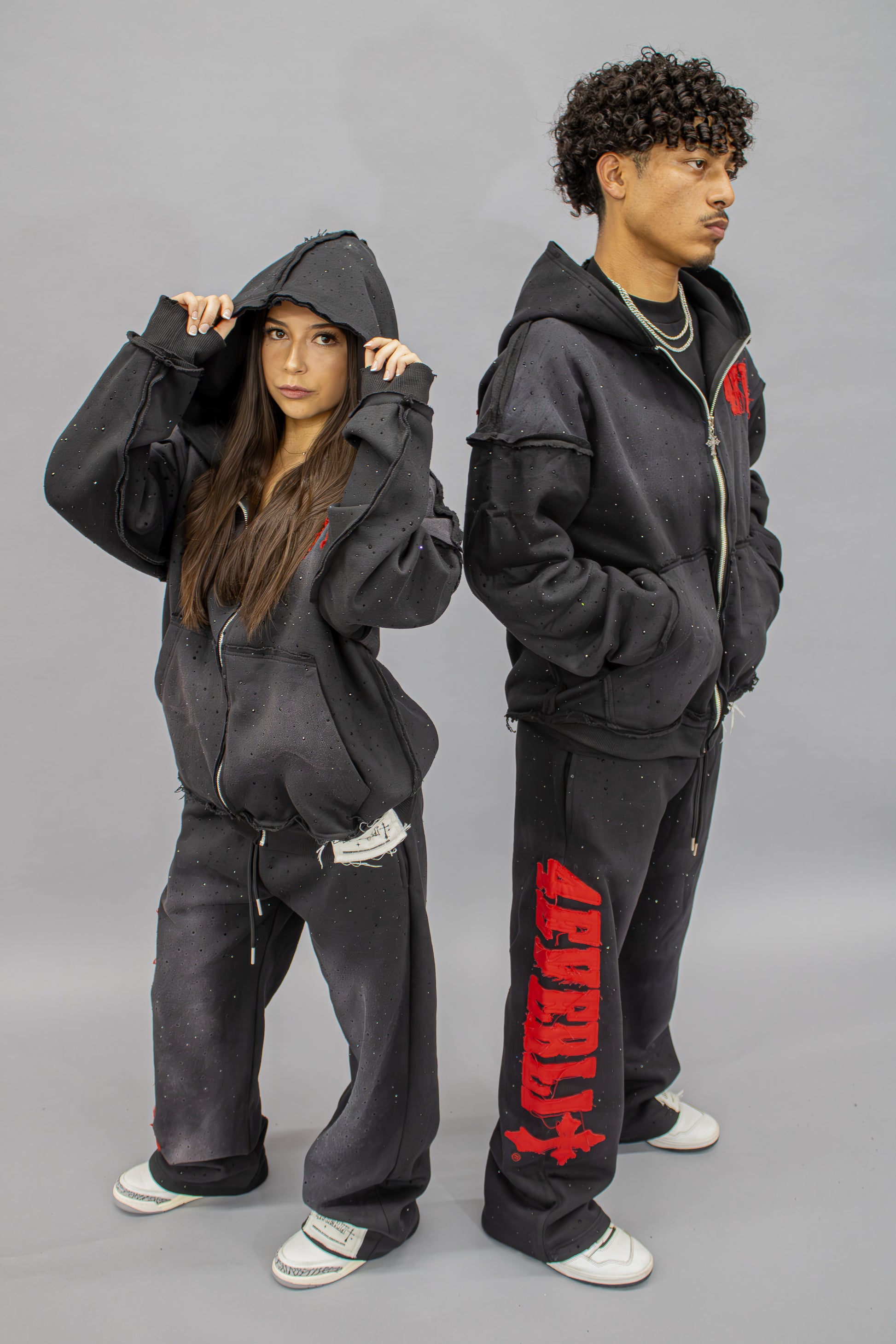 The Solace Hoodie brings together 450 GSM weight, custom cross-inspired zipper hardware, drop-shoulder structure, and a full rhinestone-covered finish for a bold luxury streetwear look. Warm, structured, and premium — this hoodie is designed to shine.